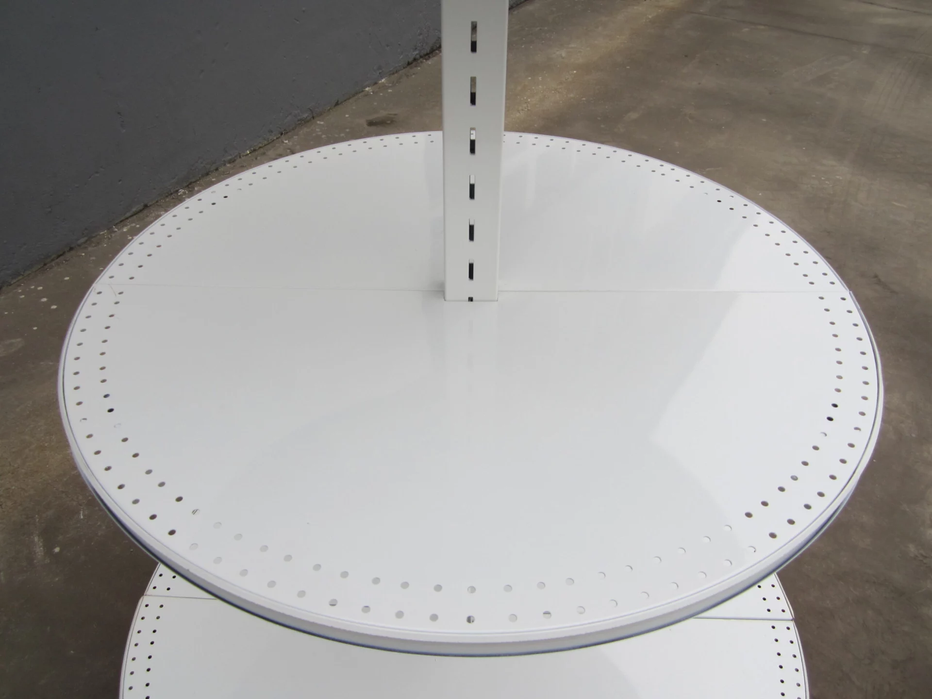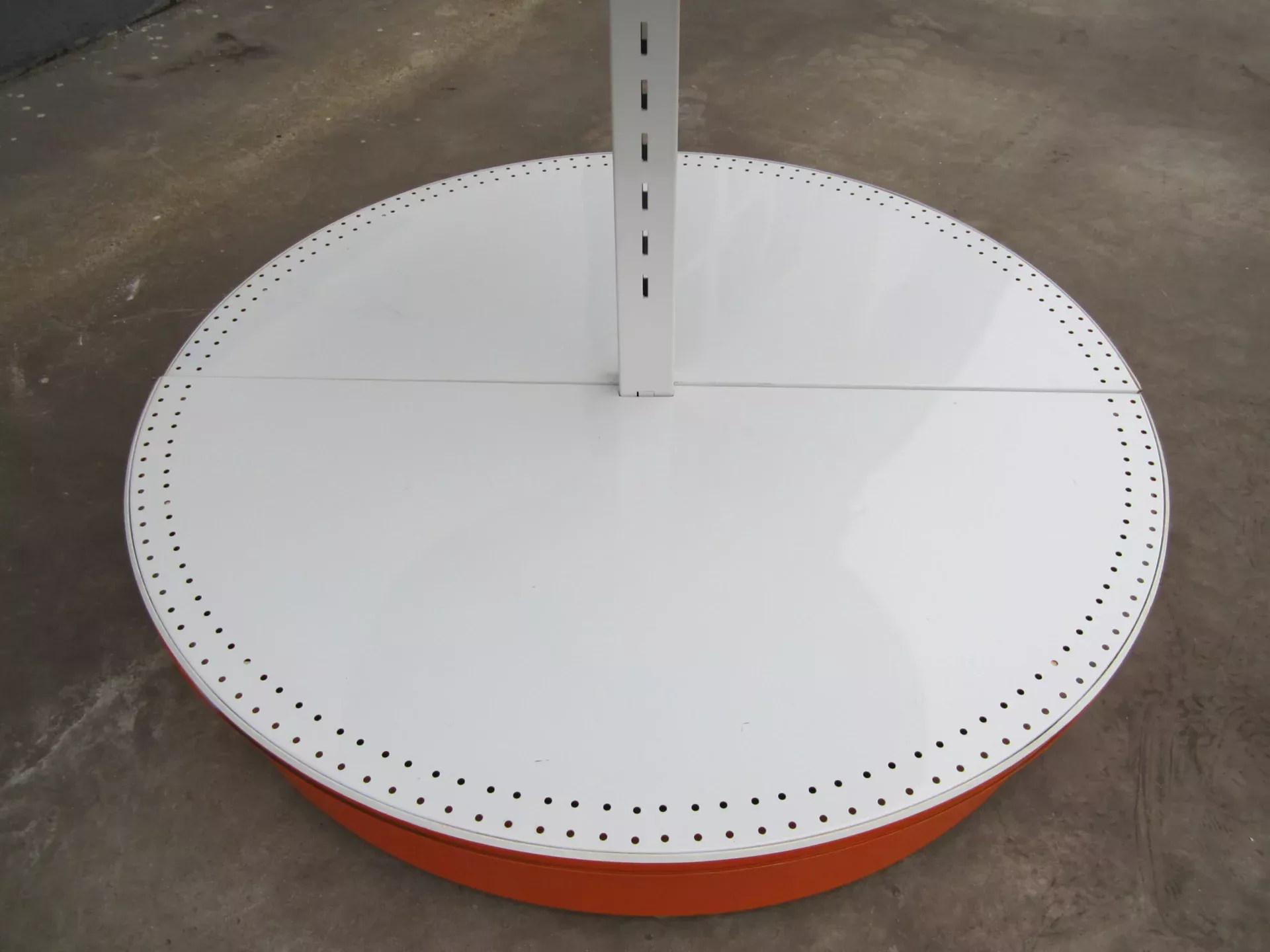 This full circle shelf has 5 layers, with the bottom layer being the largest and decreasing upwards. This sample is designed in red and white, with white layers and red decorative panels. The color combination is fresh. Each layer is equipped with a protective fence design to prevent products from rolling off. Shared column, simple structure and easy installation. Suitable for supermarkets, convenience stores, group buying stores, etc.